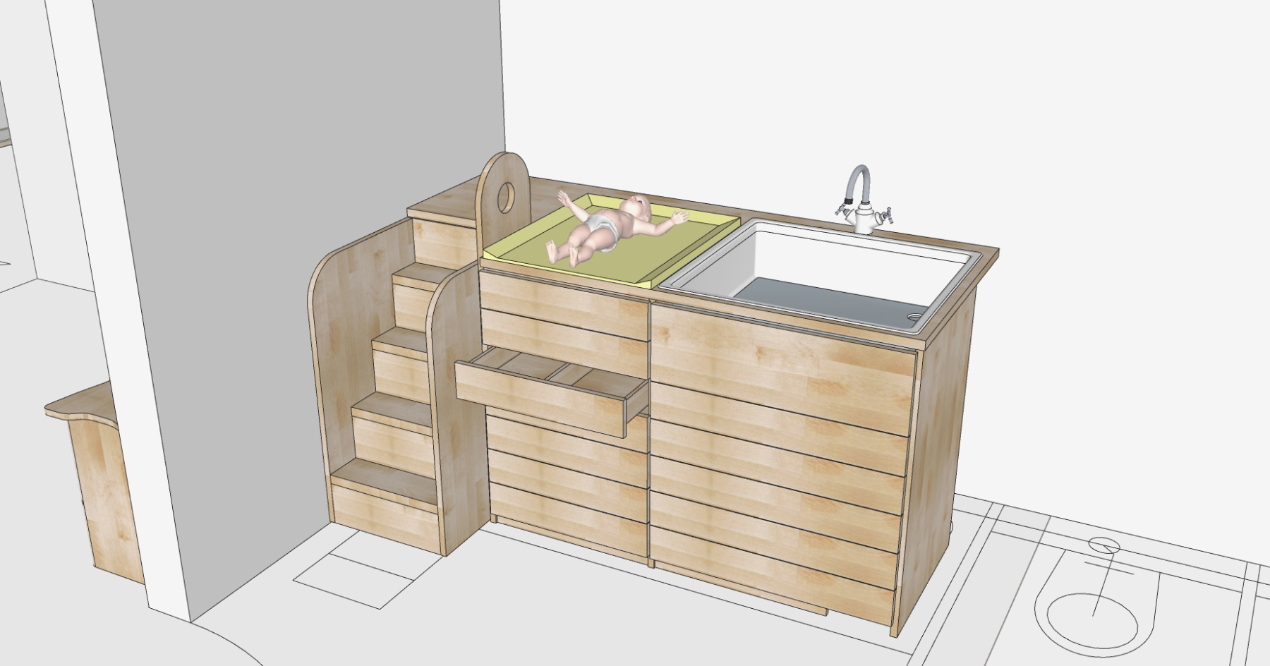 Hier sollte eine neue Einrichtung einer Kindertagsstätte nach ökologischen und gesunden Kriterien entworfen, konstruiert, gefertigt und montiert werden. Die Lösung wurde im 3D-Modell gemeinsam mit dem Nutzer in mehreren Zoom-Sitzungen entwickelt.
