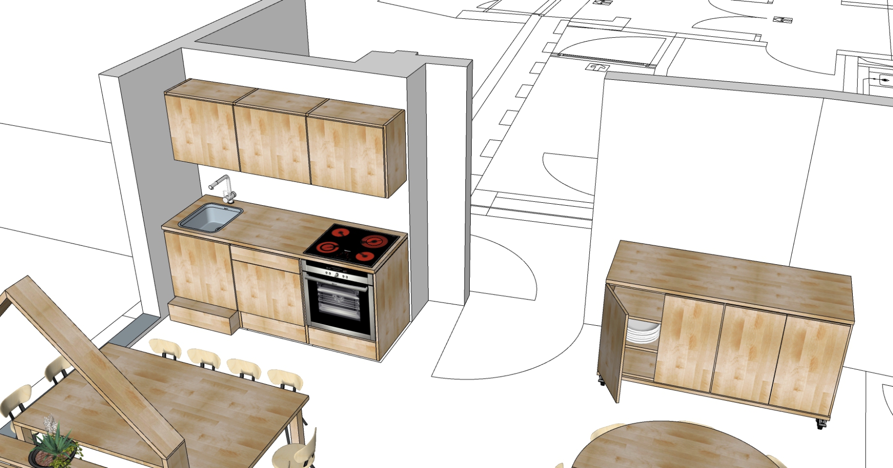Hier sollte eine neue Einrichtung einer Kindertagsstätte nach ökologischen und gesunden Kriterien entworfen, konstruiert, gefertigt und montiert werden. Die Lösung wurde im 3D-Modell gemeinsam mit dem Nutzer in mehreren Zoom-Sitzungen entwickelt.