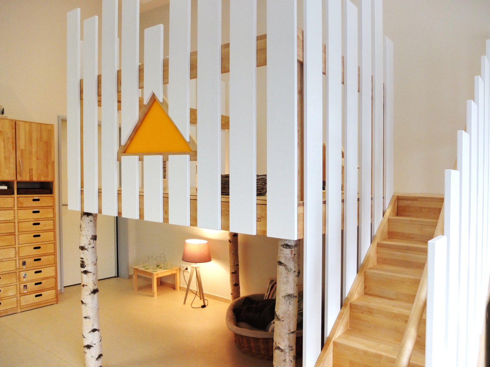 Hier sollte eine neue Einrichtung einer Kindertagsstätte nach ökologischen und gesunden Kriterien entworfen, konstruiert, gefertigt und montiert werden. Die Lösung wurde im 3D-Modell gemeinsam mit dem Nutzer in mehreren Zoom-Sitzungen entwickelt.